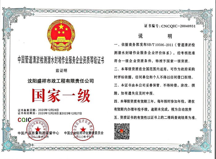 中國(guó)管道清淤檢測(cè)潛水封堵國(guó)家一級(jí)證書